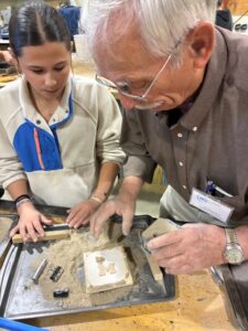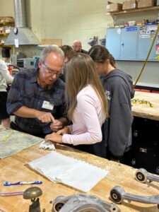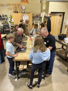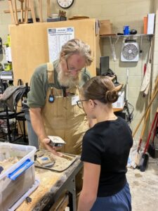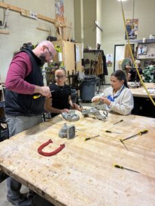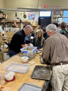 We have been working with Jamie for over 10 years. We brought our fishing lure pattern with us as well as snap rings and the snap ring tool. We were able to put the rings on the casting. Students will have to go paint up their lure and buy the size hook they want on their lure. We also added another piece of jewelry to our pattern collection today. We also brought the jumper rings to put on the casting in the classroom. We wanted to make sure the student could actually put the jewelry on a chain without going to the store. Some students put their casting on their chain in class today. You will see that in the pictures. We had one student with a medallion on a chain. A couple of us said (hey, we can cast that). So we did. She was so thrilled to have a duplicate. Check the photo out.
