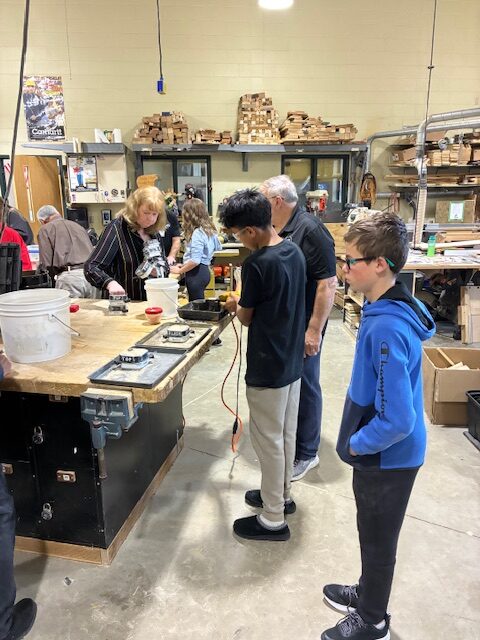 We have been working with Jamie for over 10 years. We brought our fishing lure pattern with us as well as snap rings and the snap ring tool. We were able to put the rings on the casting. Students will have to go paint up their lure and buy the size hook they want on their lure. We also added another piece of jewelry to our pattern collection today. We also brought the jumper rings to put on the casting in the classroom. We wanted to make sure the student could actually put the jewelry on a chain without going to the store. Some students put their casting on their chain in class today. You will see that in the pictures. We had one student with a medallion on a chain. A couple of us said (hey, we can cast that). So we did. She was so thrilled to have a duplicate. Check the photo out.