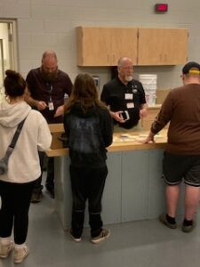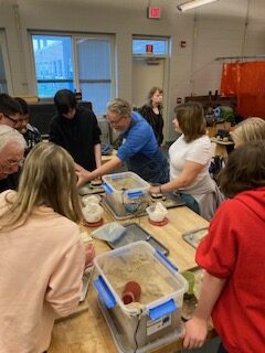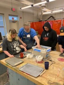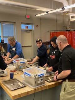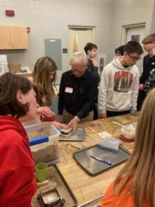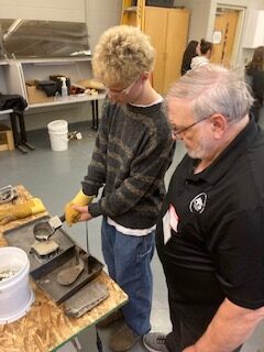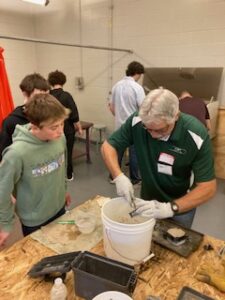 Thanks to Andy, John, Laurie, Randy, Len, Marty, Don, Scott, Bruce and Bill. Bill joins us for the first time. He had 30 years in the foundry business. Don has 50 years in the industry. He also is a Real Estate Broker. Also a Rotary volunteer and many other service projects. We did a Foundry in a Box demonstration for two of Jeremy’s engineering classes. The students made their own 3d printed patterns and they casted them. Jeremy has a sand station in his classroom so they test their patterns out to see if they work or not. If not, they try again to get ready for us. We also hosted a special needs class, an art class and a construction class. We got to demonstrate for about 70 students.